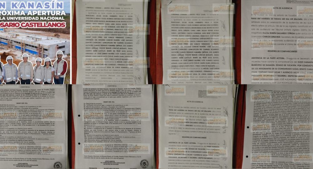 Kanasín, Yucatán, México a 23/04/2026-. Las tierras robadas a los ejidatarios de Kanasín donde se construye La Universidad Nacional Rosario Castellanos (UNRC) campus Kanasín, son aquellas tierras despojadas por medio de la asamblea ficticia del 26 de diciembre del año 2010 de la que deriva la asamblea de impugnación realizada el día nueve de noviembre del año 2014 en su segunda convocatoria que llevo a la demanda de juicio agrario expediente TUA 34-1919/2014 promovidos por el entonces comisario ejidal Benito Canul, por presiones de un grupo de ejidatarios encabezados por Catalino Cauich Chan, debido a las anomalías que el anterior comisario ejidal Marcelino Uicab Uicab quien se prestó a la corrupción del Priísmo que gobernaba Yucatán y del grupo Tabasco compuesto por el ex secretario de finanzas del gobierno tabasqueño Andrés Granier Melo, en los que figuran dentro de la documentación tanto de las actas de asambleas ficticias como en la asamblea de impugnación del nueve de noviembre del año 2024 y en la demanda puesta en el Tribunal Unitario Agrario #34, empresarios identificados como parte del cartel agrario inmobiliario de Yucatán, entre esos nombre figura el de Hernán Cárdenas Cámara, ligado al actual gobernador morenista Joaquín Díaz Mena y presunto patrocinador de la campaña política del hoy gobernador.